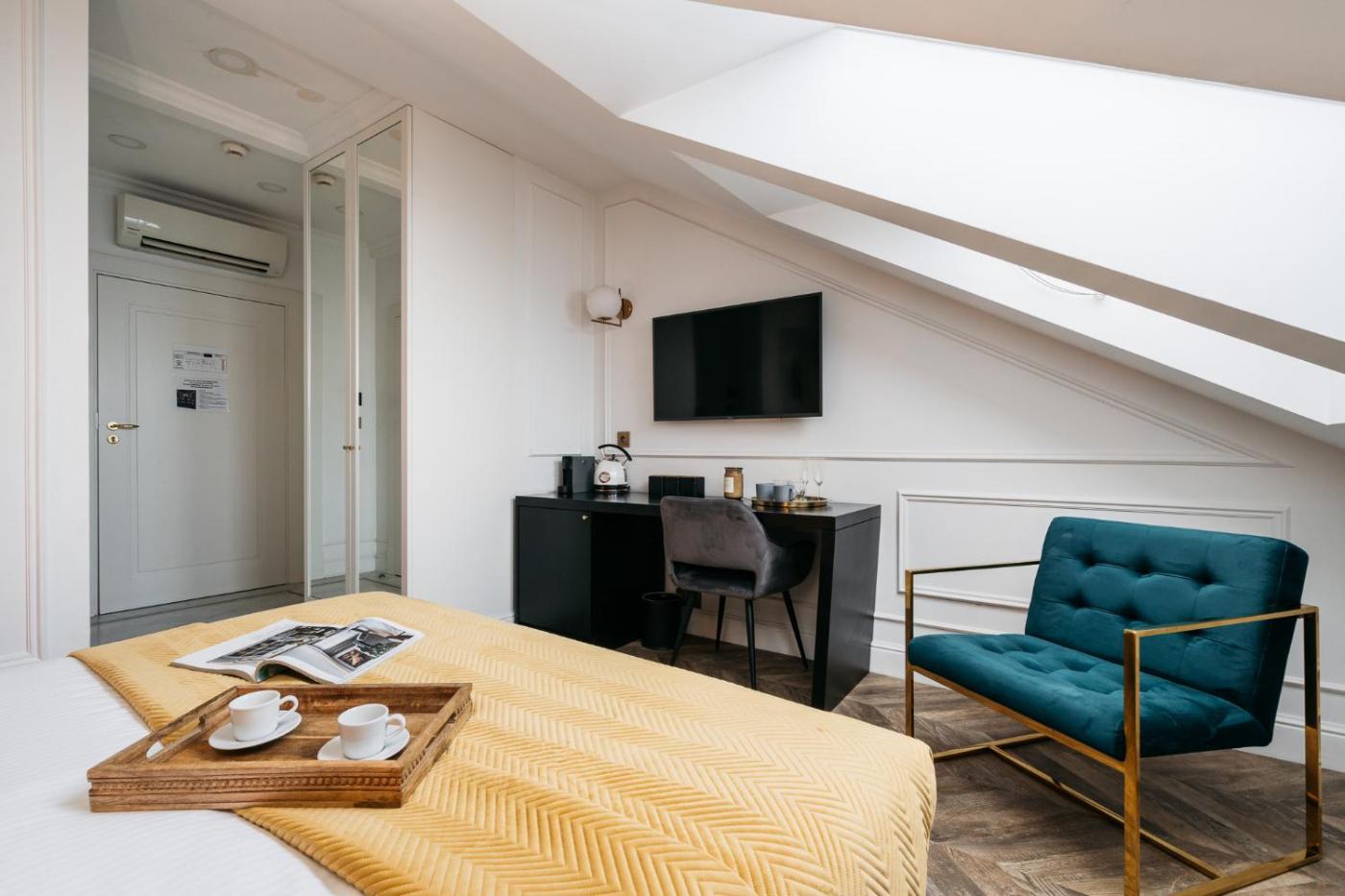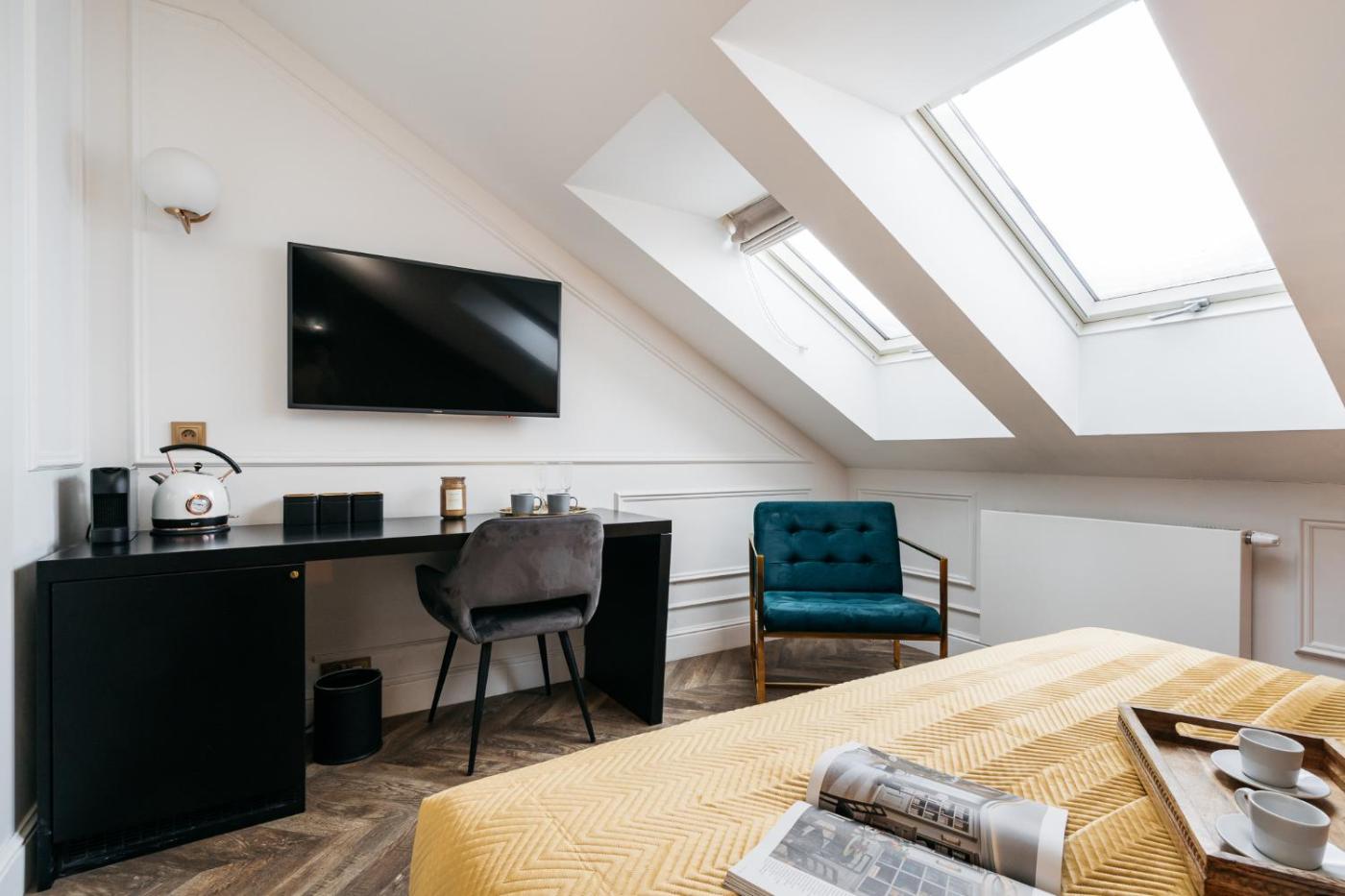 Pokój Dwuosobowy typu Deluxe. Providing free toiletries, this double room includes a private bathroom with a walk-in shower, a hairdryer and slippers. This double room is air-conditioned and features a flat-screen TV, a tea and coffee maker, a wardrobe and parquet floors. The unit offers 1 bed. Powierzchnia pokoju ok.: 20 mkw. ;